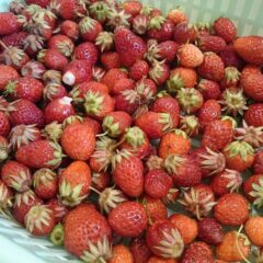 畑のいちごをみんなで摘み、フォークとスプーンで潰して果汁を生地に混ぜると……ピンク色になりみんな大興奮!