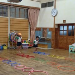 りす組さん(2歳児)は、輪投げやリズム遊びをして楽しむ姿が見られました。